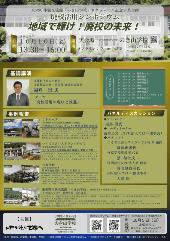 廃校活用シンポジウム「地域で輝け! 廃校の未来!」 2025年10月10日開催! ⇓⇓⇓申し込みはこちらから⇓⇓⇓⇓ 廃校シンポジウム「地域でかがやけ!廃校の未来!」申込フォーム ⇓⇓⇓申し込みはこちらから⇓⇓⇓⇓ 廃校シンポジウム「地域でかがやけ!廃校の未来!」申込フォーム イベントお申込み イベントへのご参加ご希望の方は、お申込みフォームより 必要事項をご記入の上、お申込みください。 イベントお申込みフォームへ 一覧へ戻る
