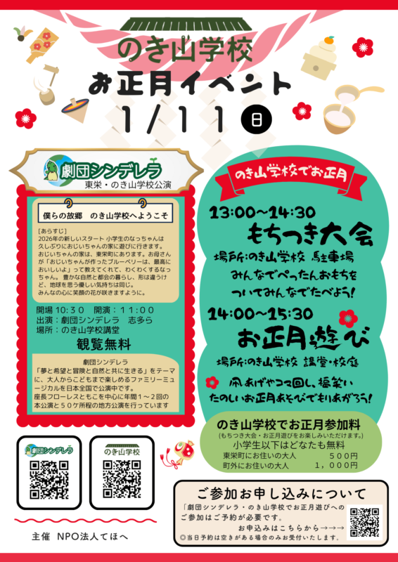 のき山学校 お正月イベント 2026年1月11日開催! →→→お正月イベントのもうしこみはこちらを開いてね!←←← →→→お正月イベントのもうしこみはこちらを開いてね!←←← イベントお申込み イベントへのご参加ご希望の方は、お申込みフォームより 必要事項をご記入の上、お申込みください。 イベントお申込みフォームへ 一覧へ戻る