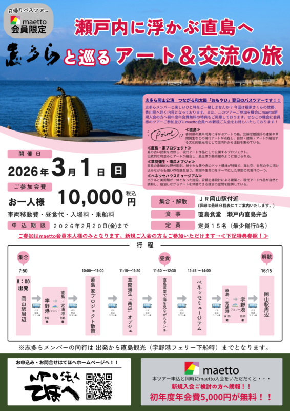 おもやひ 岡山公演の翌日! maetto限定 バスツアー 2026年3月1日開催! キャンセル出ました! 改めてご参加者募集中です!! click→→ バスツアーの申し込みはこちらを開いてね! ←←click click→→ バスツアーの申し込みはこちらを開いてね! ←←click イベントお申込み イベントへのご参加ご希望の方は、お申込みフォームより 必要事項をご記入の上、お申込みください。 イベントお申込みフォームへ 一覧へ戻る