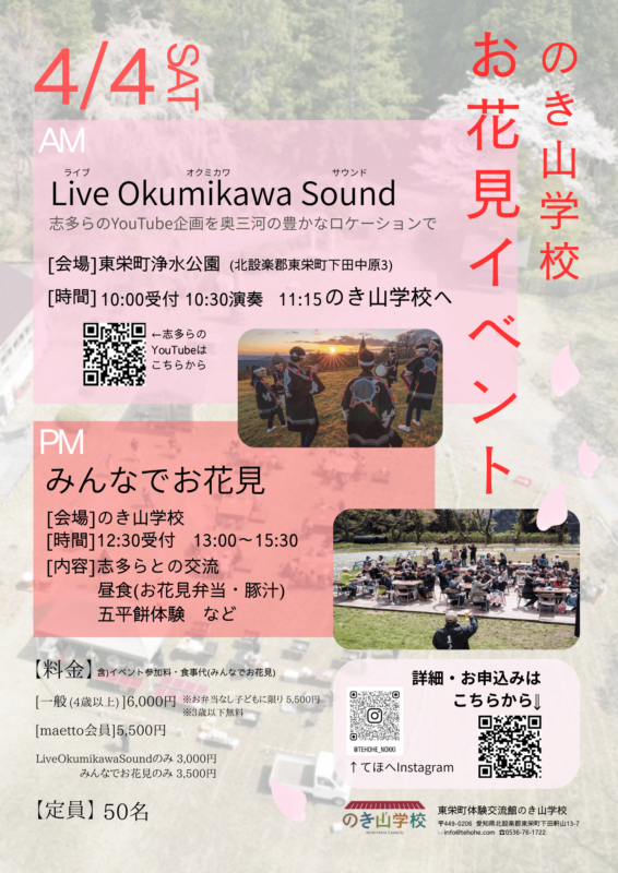 Live Okumikawasound & みんなでお花見 2026年4月4日開催! click→→お申込みはコチラ←←click click→→お申込みはコチラ←←click イベントお申込み イベントへのご参加ご希望の方は、お申込みフォームより 必要事項をご記入の上、お申込みください。 イベントお申込みフォームへ 一覧へ戻る